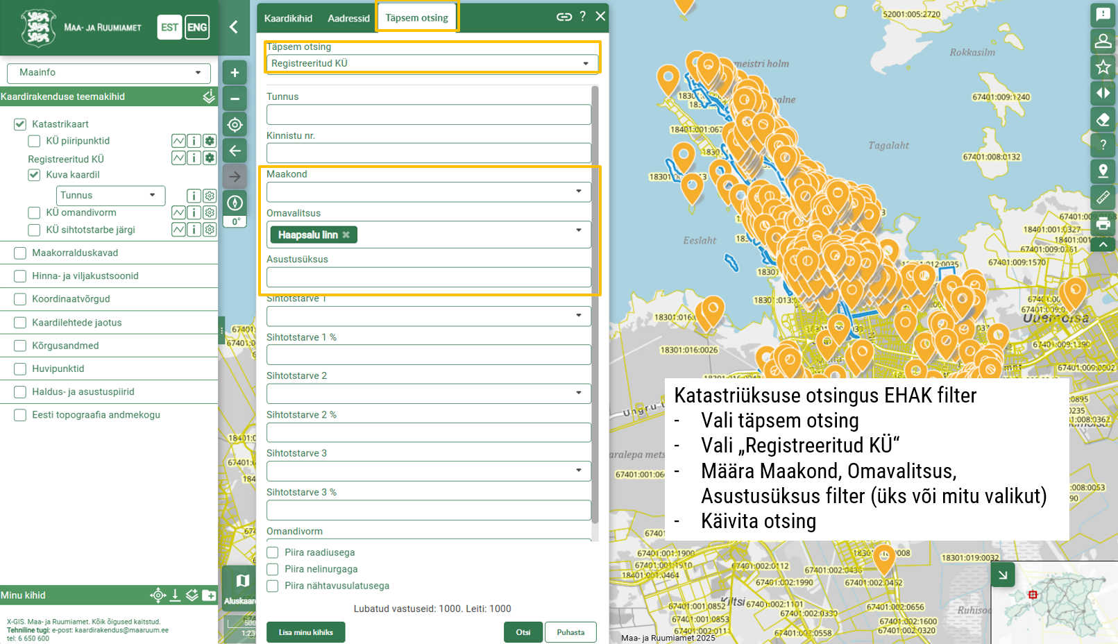 - Katastrikaardi otsingut saab filtreerida maakonna, omavalitsuse ja asustusüksuse nime järgi.