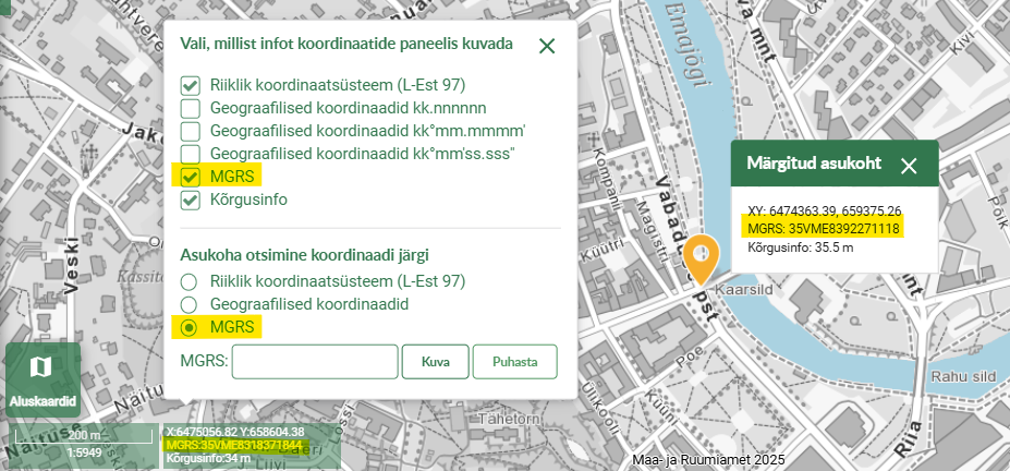 Kaardirakendustes on võimalik otsida ja kuvada 1 m täpsusega MGRS koordinaate. MGRS on kasutusel militaarvaldkonnas. Koordinaatide nägemiseks infopäringus või asukoha märkimisel tuleb kaardiakna all servas paikneval koordinaatide paneelil MGRS eelnevalt sisse lülitada. Koordinaatide saab kasutada ka otsinguaknas.
